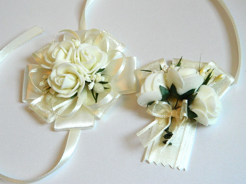 Cvetic za rever veliki od satenske i organdin trake sa ruzicom i ledenom bobicom.