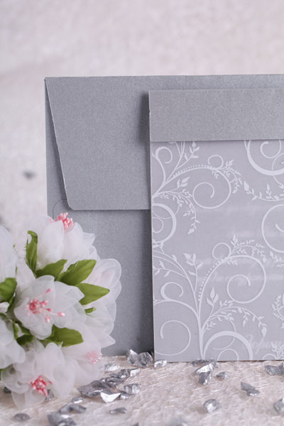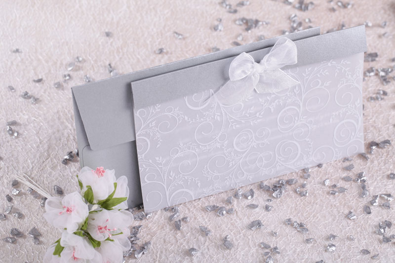 Pozivnica i koverta su od sedefastog papira, paus sa šarom i mašna.